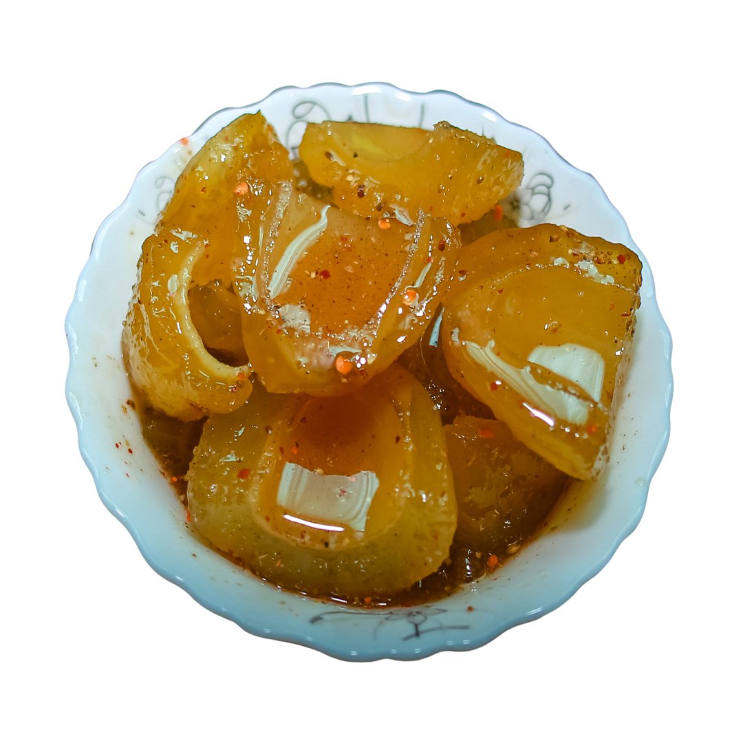 টক ঝাল মিষ্টি স্বাদের এই আচার ভাত,খিচুরি, পোলাও কিংবা এমনি এমনি , সবেতেই মানিয়ে যাবে। যারা মোটামুটি মিষ্টি আর খুব হালকা টক-ঝাল খান এই আচারটা তাদের জন্যই ।