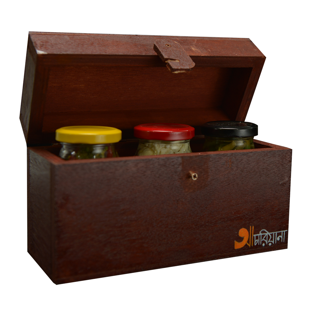 গুপ্তধনের বাক্সের মতন আচারি বাক্স খুললেই পাবেন তিন পদের আচার বাহারি!! আচারি সিন্দুক সেজেছে আমের তিনটি বাহারী আচার নিয়ে।অনেকেরই একটি প্রশ্ন থাকে, 'আচারি সিন্দুক অর্ডার করলে কাঠের বাক্সটাও কি পাবো?'। উত্তর হলো- 'হ্যাঁ । বাক্সগুলো হাতে তৈরী৷ তাই,ছোটখাটো ত্রুটি থাকতে পারে যা ভবিষ্যতে সময়ের সাথে সাথে হয়তো আমরা জয় করে নিবো। কারিগর বলেছে এই সিন্দুকের আয়ু অন্তত ৩০ বছর(যদি যত্নে রাখা হয়)!
